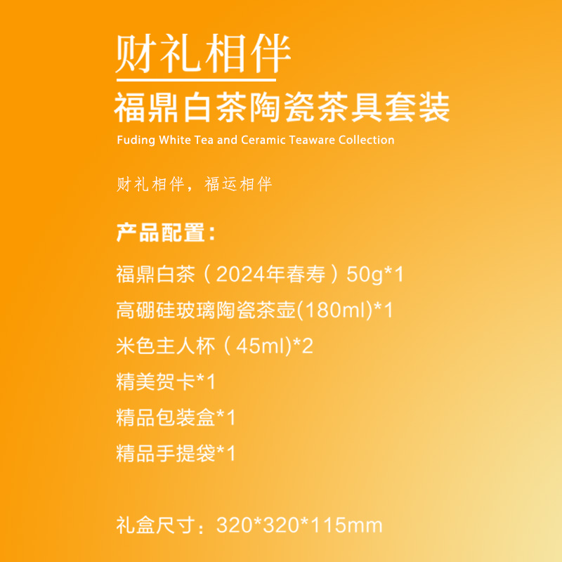 【产品配置】 福鼎白茶(2024年春寿)50g*1 高硼硅玻璃陶瓷茶壶(180ml)*1 米色主人杯(45ml)*2 精美贺卡*1 精品包装盒*1 精品手提袋*1 【产品说明】 财礼相伴+福运寓意,商务新年礼赠佳选; 2024 春寿福鼎白茶+陶瓷茶具,茶器双优; 高硼硅茶壶+米色主人杯,品质茶具实用; 精品包装+手提袋贺卡,礼赠体面有档次; 茶叶茶具组合,一站式商务新年礼解决方案。