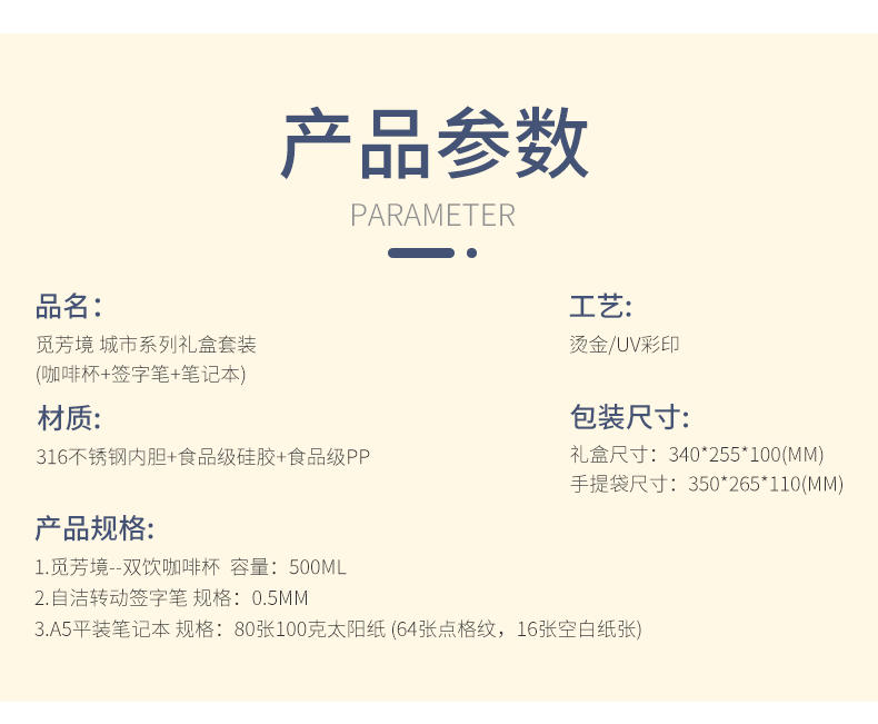 1.觅芳境--双饮咖啡杯 容量:500ml 内胆:316 外壳:304 杯盖:食品级PP 吸管:食品级硅胶 吸嘴:食品级PP 密封圈:食品级硅胶 2.自洁转动签字笔 规格:0.5mm 3.A5平装笔记本 规格:80张100克太阳纸 (64张点格纹,16张空白纸张) 礼盒尺寸:34*25.5*10cm 手提袋尺寸:35*26.5*11cm