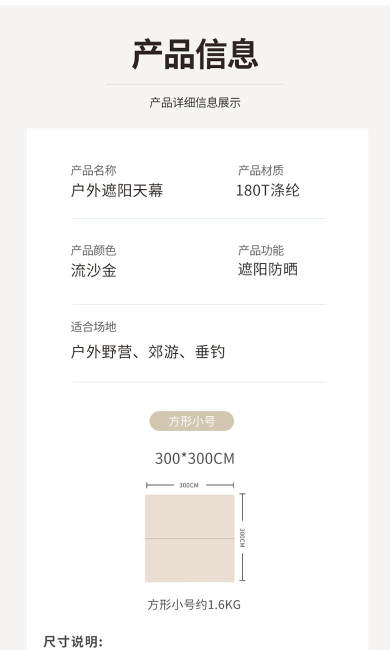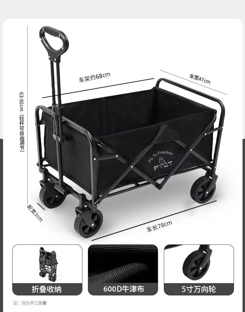 配置:银胶天幕+方桌五件套+露营车 桌椅材质:600D双层牛津布 +镀锌钢管 天幕材质:210D防水牛津布 露营车材质:镀锌铁管+牛津布 桌子尺寸:51*50*53cm 椅子尺寸:65*39*39cm 天幕尺寸:3*3m 露营车尺寸:5寸轮 商品重量:约16kg