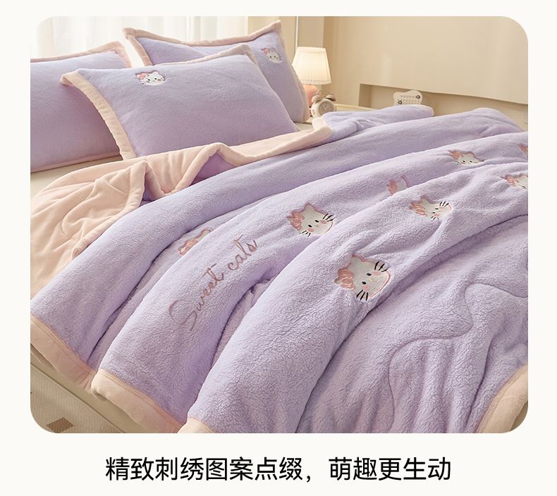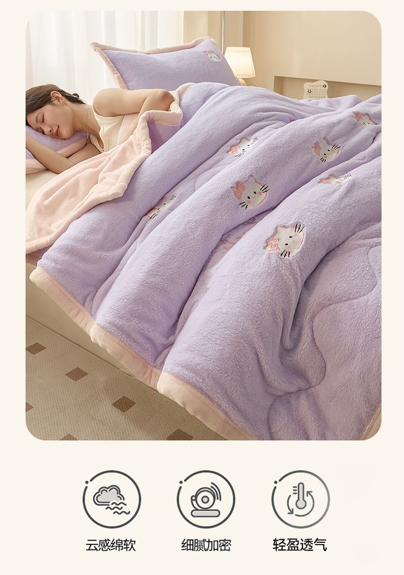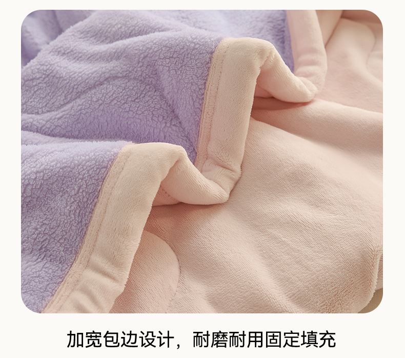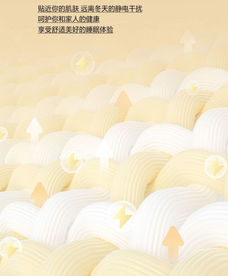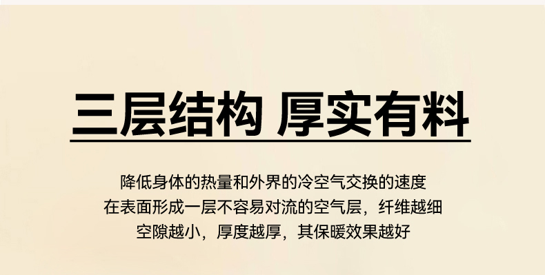 双面高克重牛奶绒面料,手感厚实保暖 柔软裹身 陷入温柔怀抱,三层结构 厚实有料,整张夹棉填充设计,细腻羽丝绒纤维填充,蓬松舒适 不易成坨,保暖性好 适合贴身使用