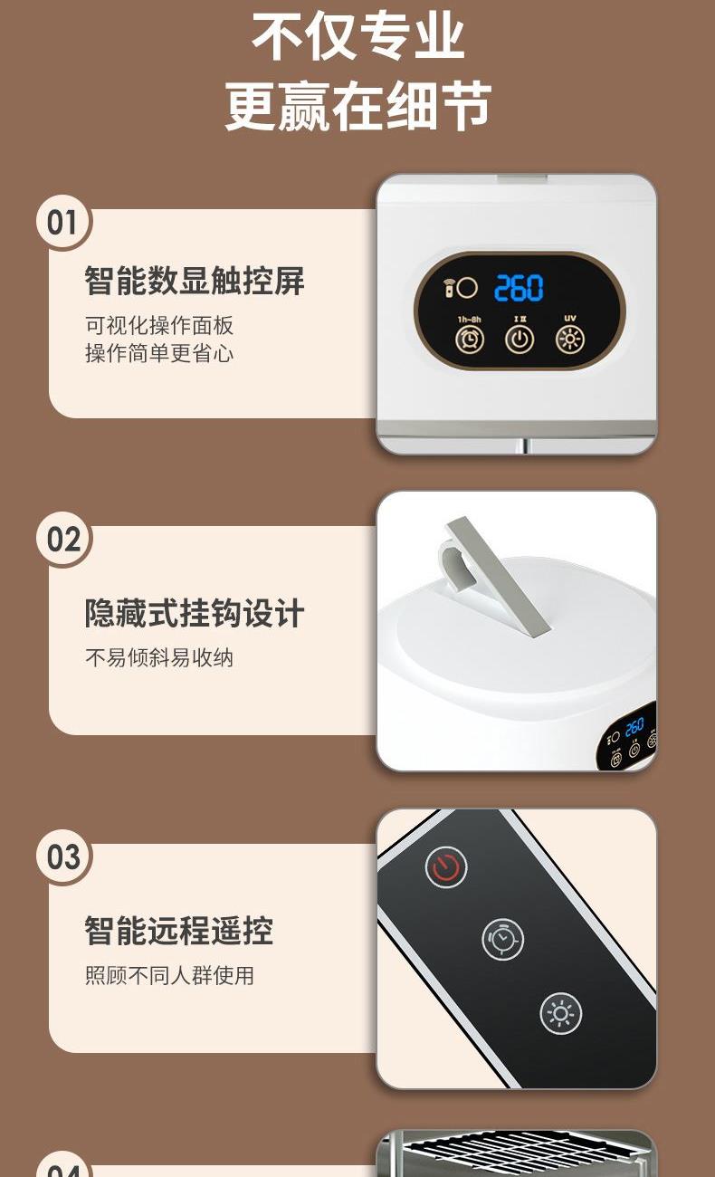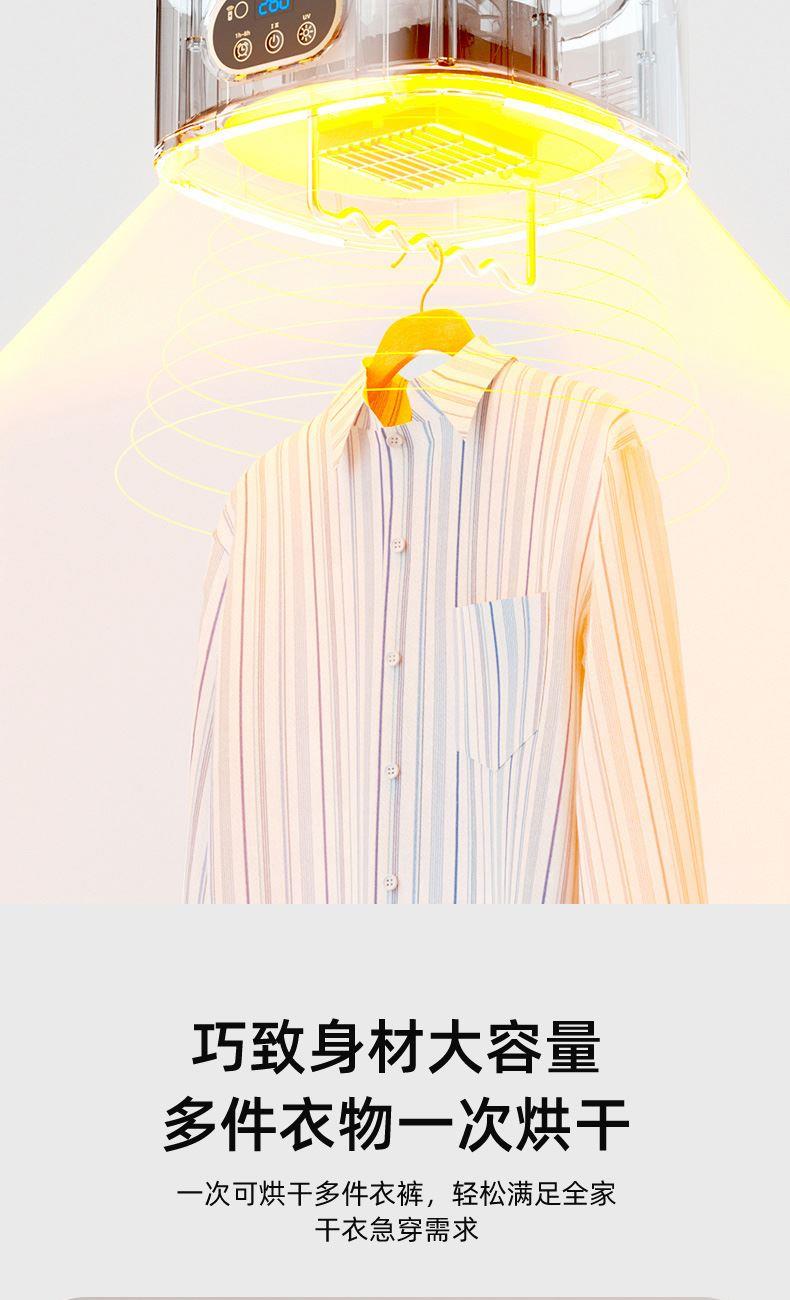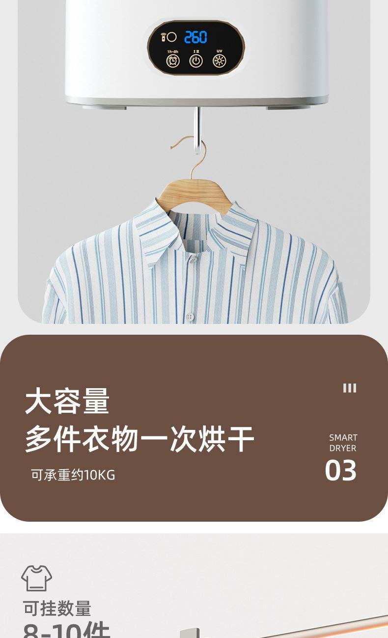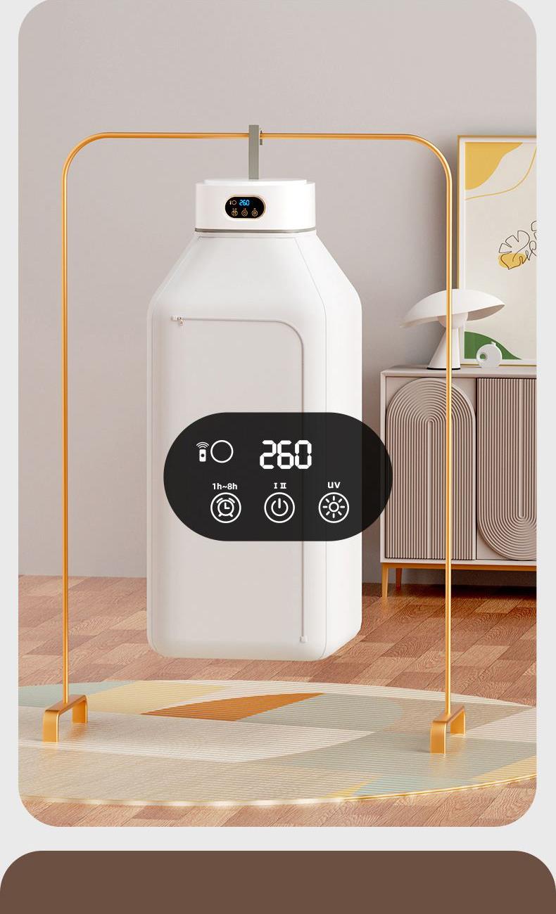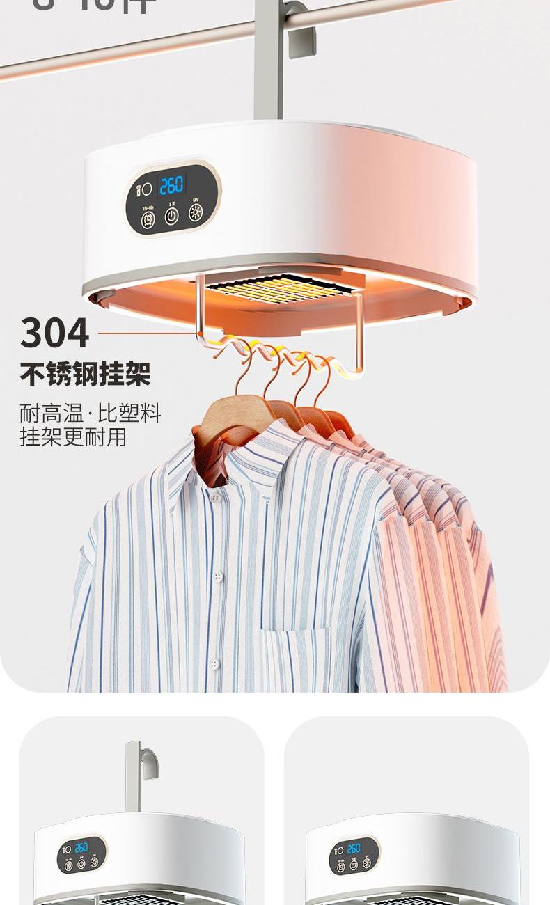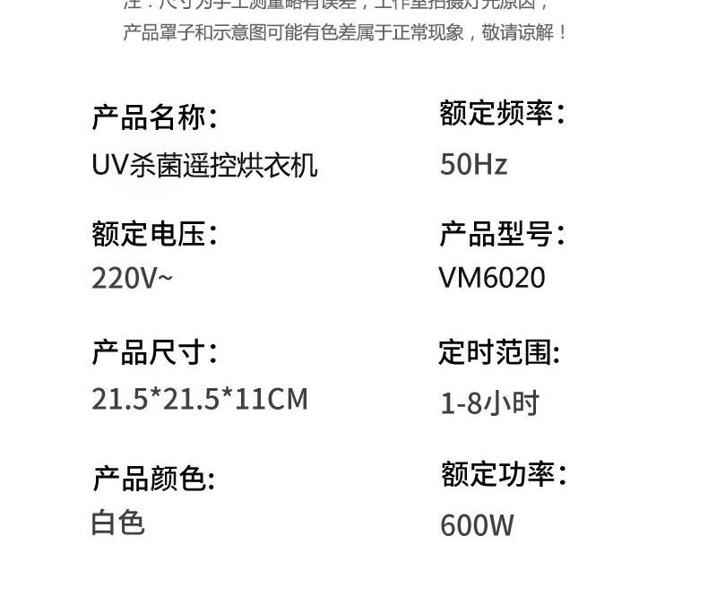 产品:UV灯遥控烘衣机 承载重量:5-10kg 发热温度:68°C左右 功能:UV灯消毒 加热方式:PTC;档位:2档 挂钩材质:304不锈钢 额定频率:50HZ 额定电压:220V 功率:501W(含)-1000W(含) 定时范围:1-8小时;控制方式:触控按键、遥控器 产品重量:净重1.2kg/泡重1.6kg 单台包装尺寸:25.2*23.2*12cm