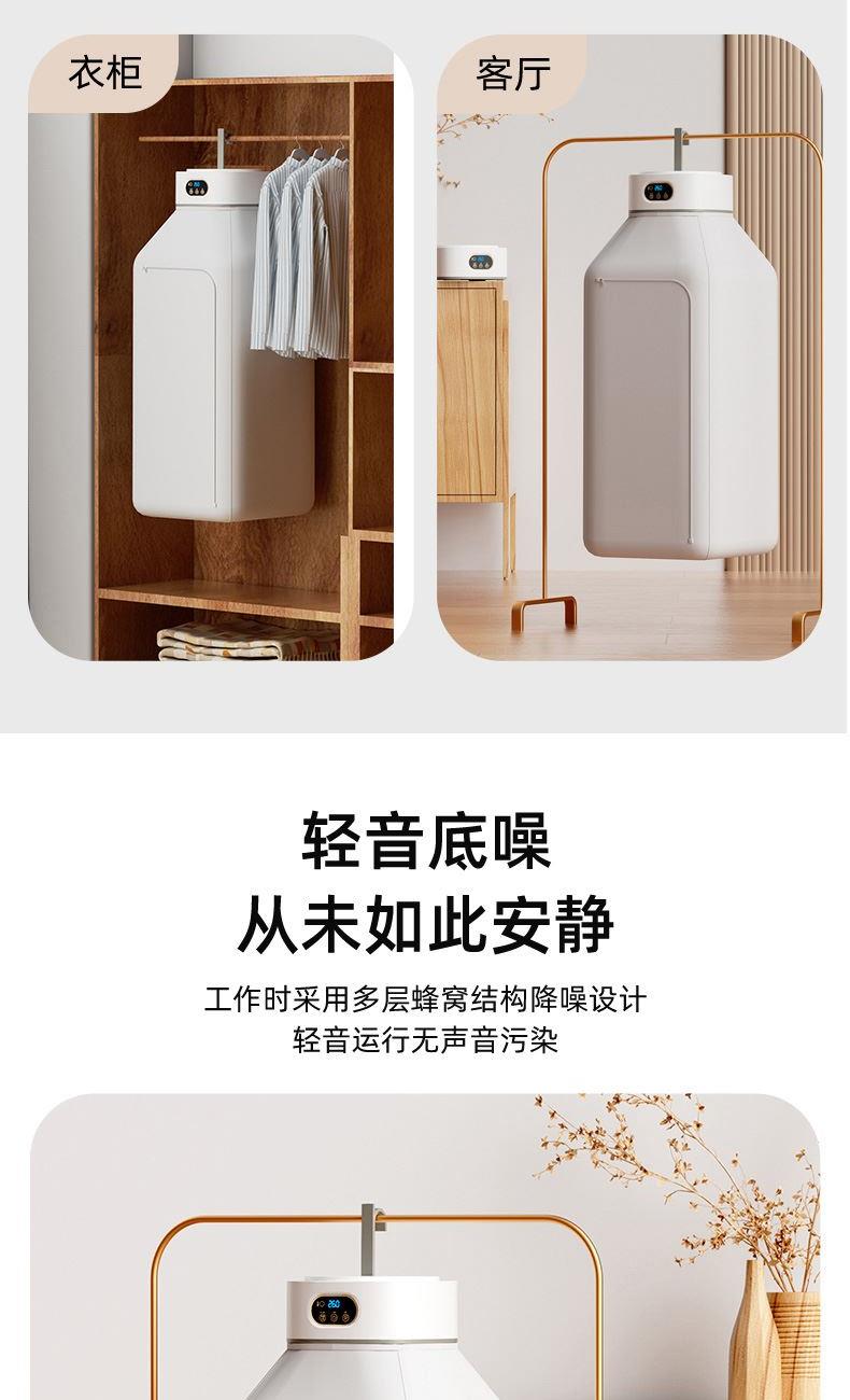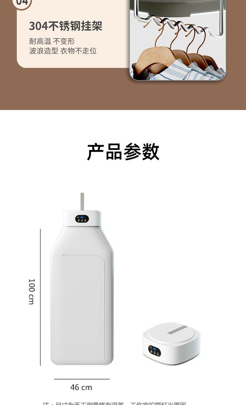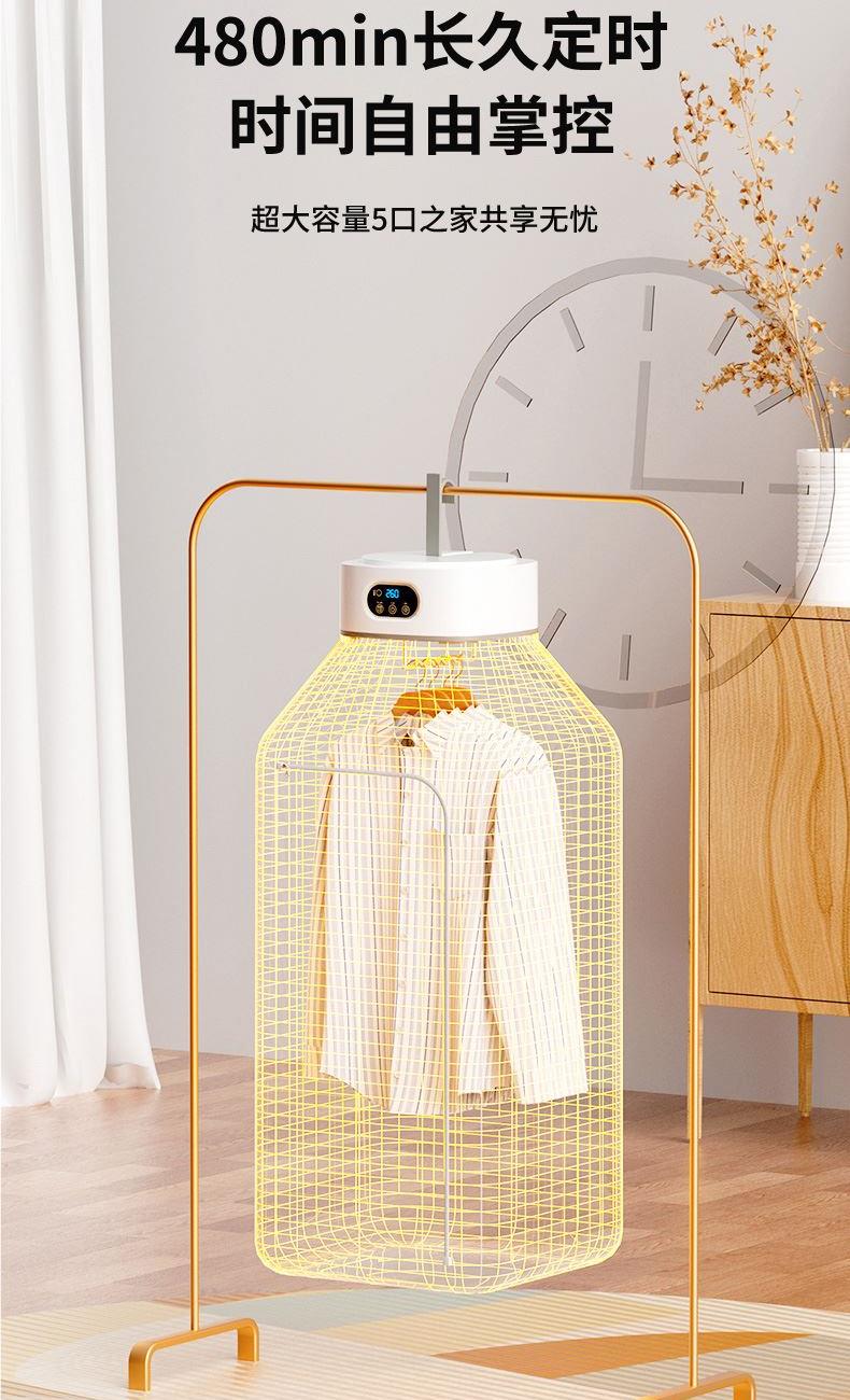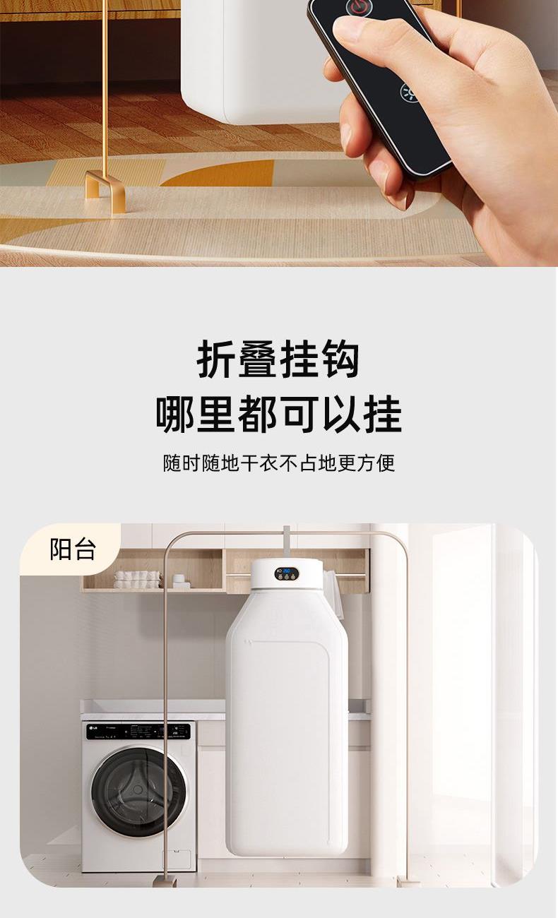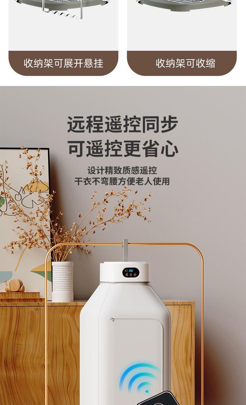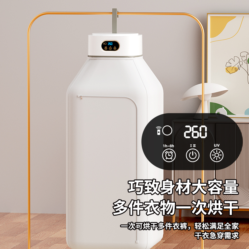 产品:UV灯遥控烘衣机 承载重量:5-10kg 发热温度:68°C左右 功能:UV灯消毒 加热方式:PTC;档位:2档 挂钩材质:304不锈钢 额定频率:50HZ 额定电压:220V 功率:501W(含)-1000W(含) 定时范围:1-8小时;控制方式:触控按键、遥控器 产品重量:净重1.2kg/泡重1.6kg 单台包装尺寸:25.2*23.2*12cm
