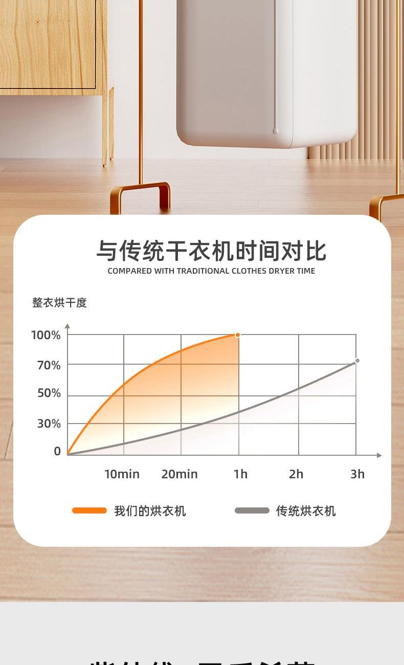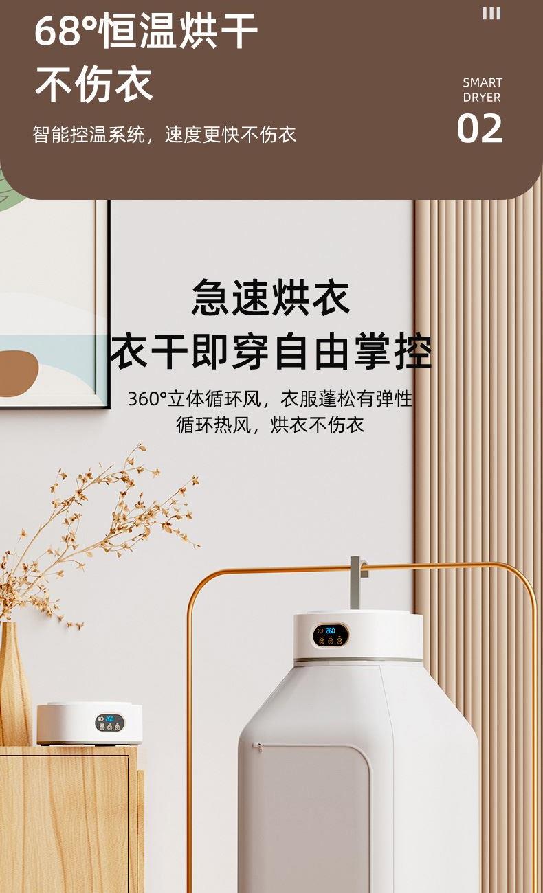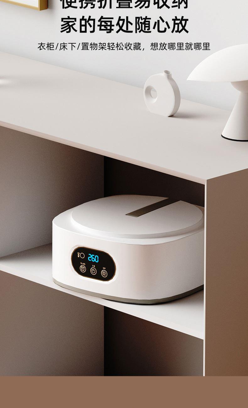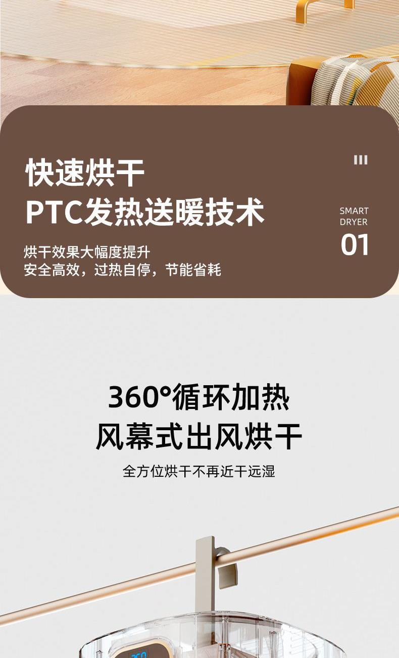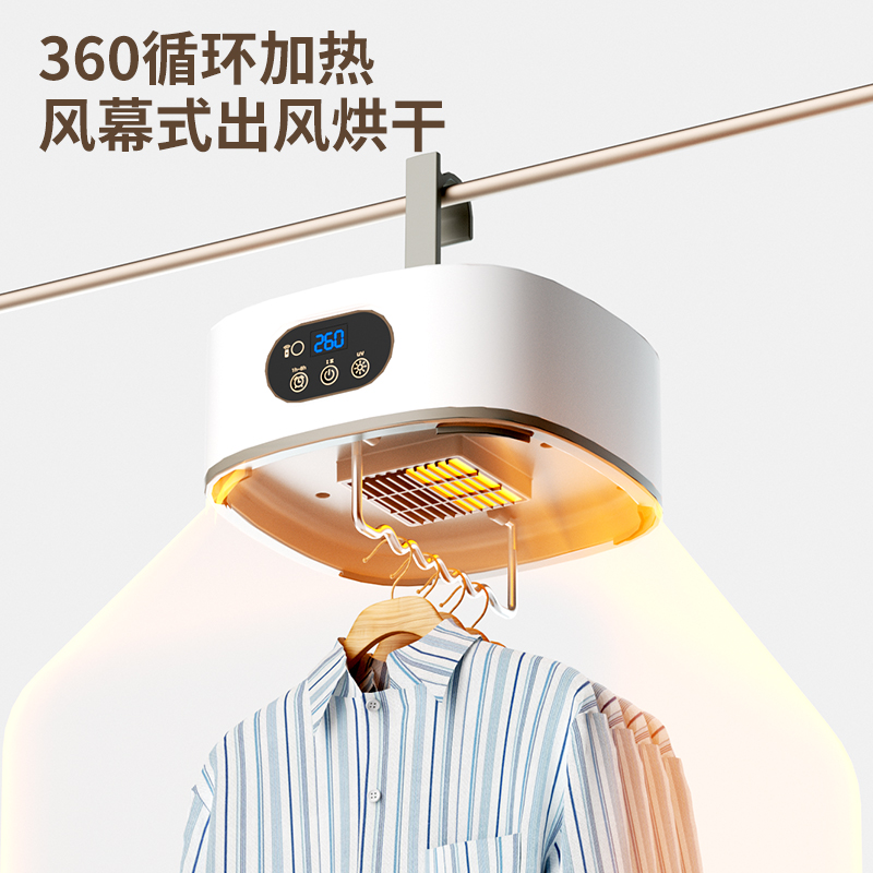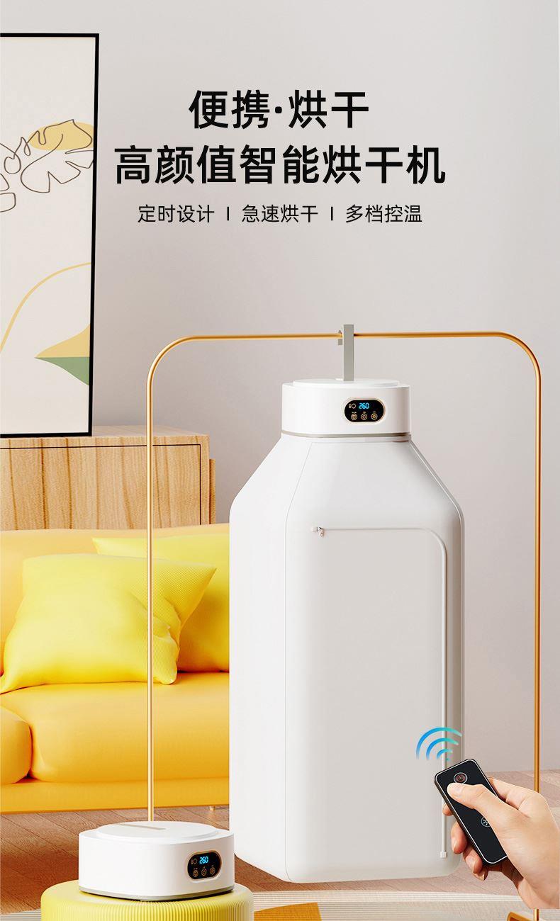 产品:UV灯遥控烘衣机 承载重量:5-10kg 发热温度:68°C左右 功能:UV灯消毒 加热方式:PTC;档位:2档 挂钩材质:304不锈钢 额定频率:50HZ 额定电压:220V 功率:501W(含)-1000W(含) 定时范围:1-8小时;控制方式:触控按键、遥控器 产品重量:净重1.2kg/泡重1.6kg 单台包装尺寸:25.2*23.2*12cm
