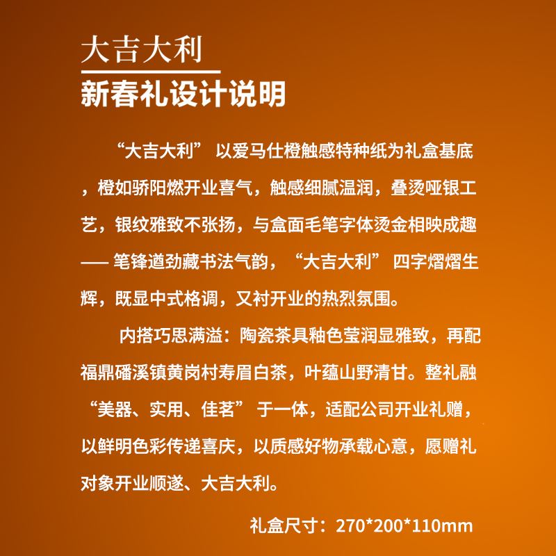 【产品配置】 高硼硅陶瓷玻璃茶具(180ml)*1 陶瓷品茗杯(45ml)*2 福鼎白茶(磻溪核心产区春寿30g)*1 精品包装盒*1 精品手提袋*1 【产品说明】 爱马仕橙外观,礼品视觉吸睛; 福鼎磻溪核心产区春寿白茶,茶品品质上乘; 高硼硅陶瓷玻璃茶具,耐用且泡茶体验佳; “大吉大利”吉祥寓意,开门红送礼讨喜; 精品礼盒+手提袋,包装精致送礼有面。