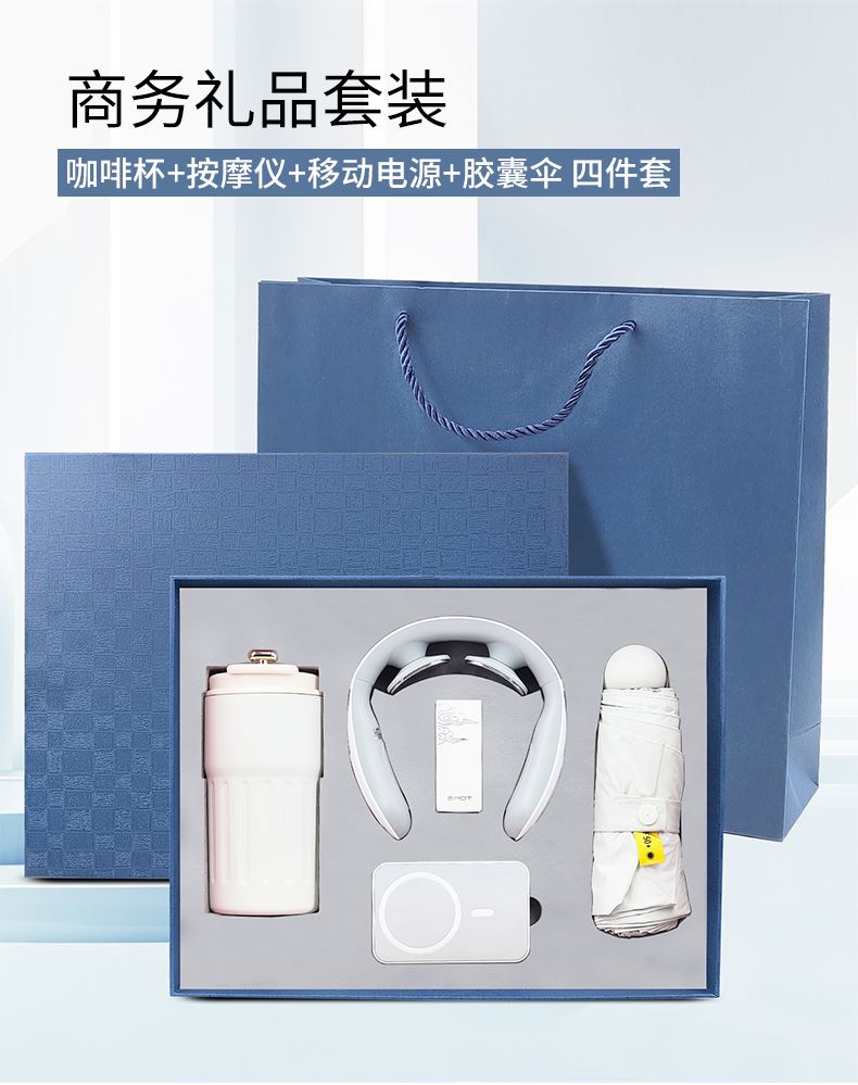 礼盒配置: 316内胆温显咖啡杯 颈部按摩仪(加热,脉冲) 21寸5折6骨钢胶囊伞(高密度碰击黑胶布) 10000毫安磁吸快充移动电源 包装盒尺寸:350x270x106mm 手提袋尺寸:360x300x116mm 重量:25kg/箱