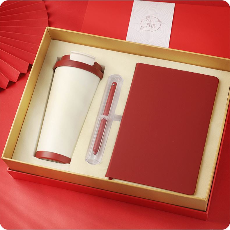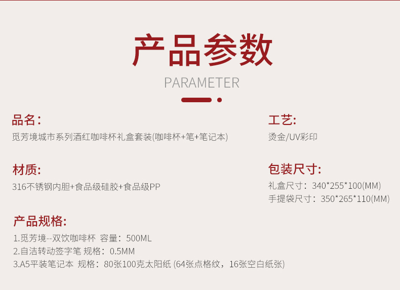 产品配置: 1.觅芳境--双饮咖啡杯 容量:500ml 材质:内胆:316 外壳:304 杯盖:食品级PP 吸管:食品级硅胶 吸嘴:食品级PP 密封圈:食品级硅胶 2.自洁转动签字笔 规格:0.5mm 3.A5平装笔记本 规格:80张100克太阳纸 64张点格纹,16张空白纸张 礼盒尺寸:34*25.5*10cm 手提袋尺寸:35*26.5*11cm
