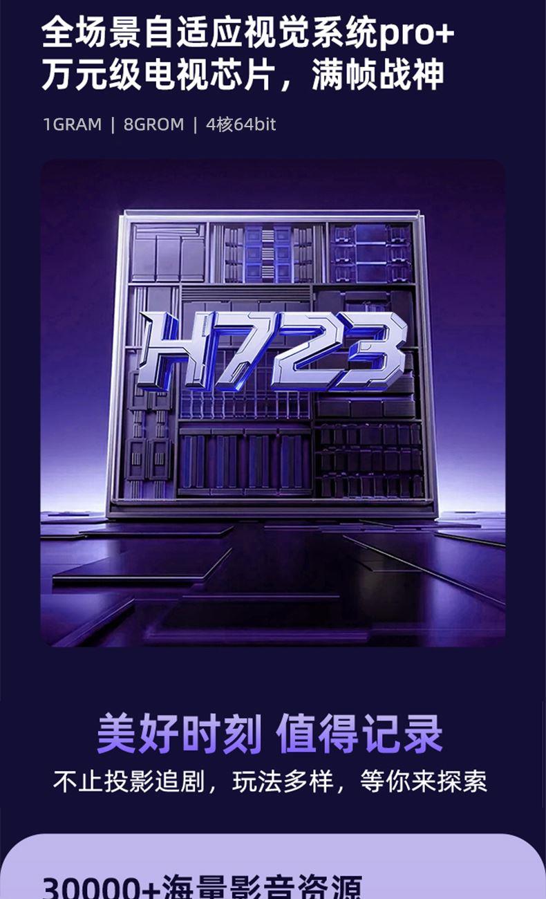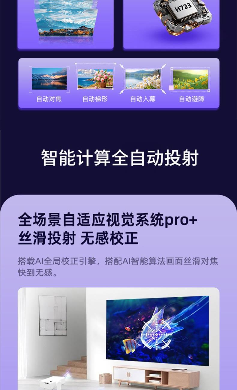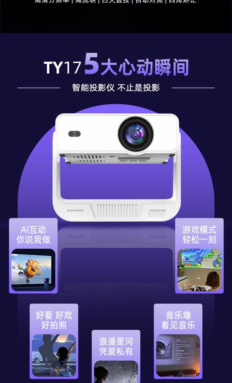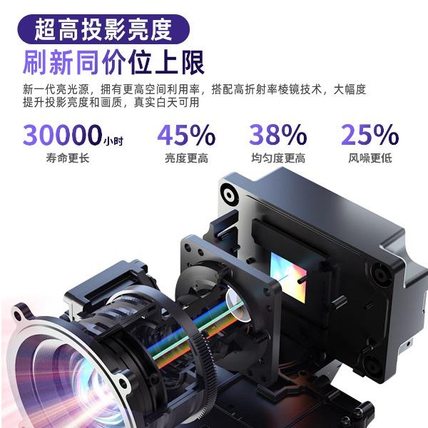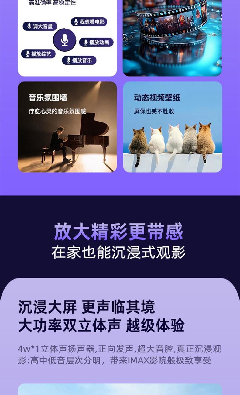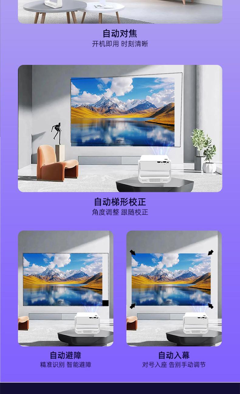 自动对焦、自动入幕、自动避障、自动梯形,无需手动调节。支持苹果安卓手机同屏/投屏,内置安卓系统海量影片可在线观看。支持1080P高清播放,内置独立音箱,可多种设备链接,手机/电脑/平板/U盘/移动硬盘/网络盒子等,漫反射原理,呵护眼睛健康