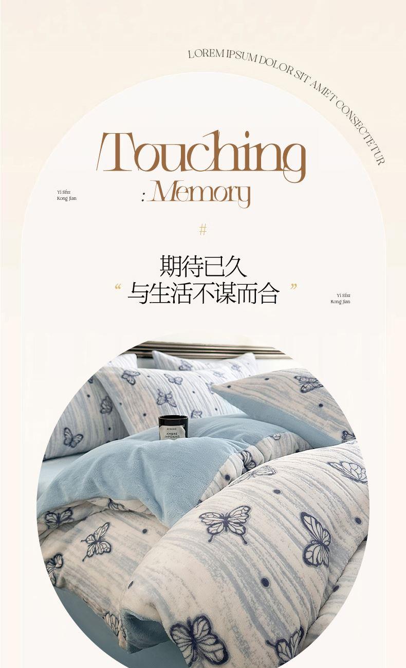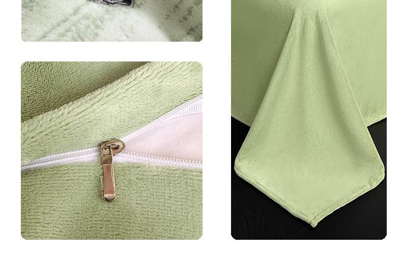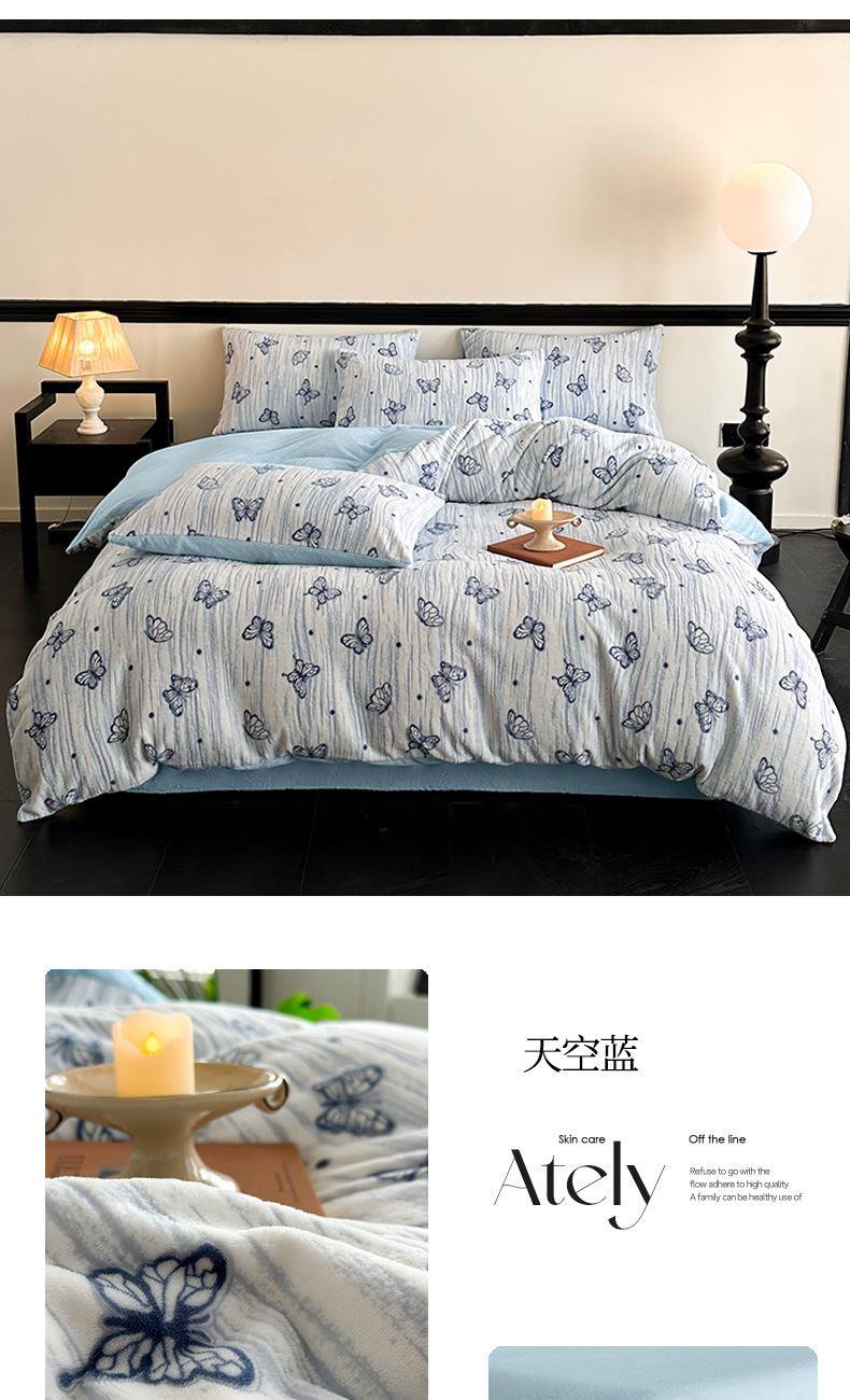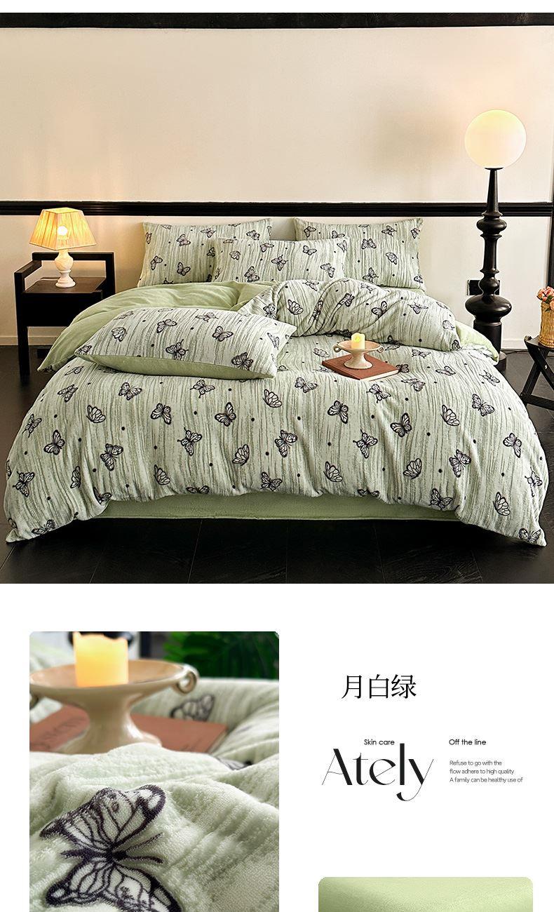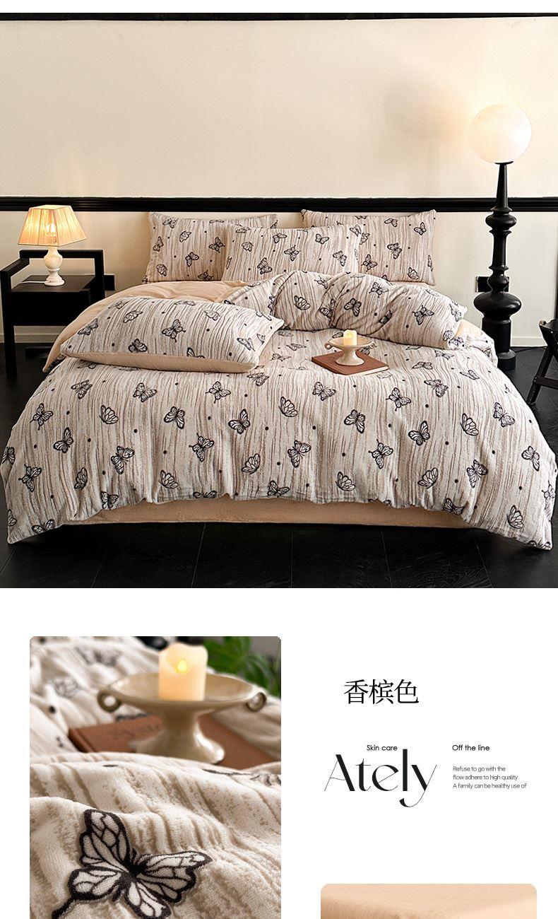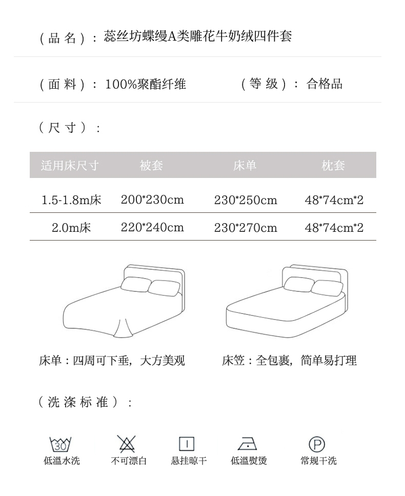 规格:1.5-1.8M床适用 被套200*230cm 床单230*250cm 枕套48*74cm 面料:牛奶绒 花色:香草灰、香槟色、月光绿、天空蓝 雕花牛奶绒面料,绒毛细密,不易起球和掉毛,撸猫般的柔顺手感,远离寒冬,高颜值AB双面设计,A面采用时髦洋气的印花图案点缀,栩栩如生,B面纯色简约,给卧室增添一抹冬日的亮色。