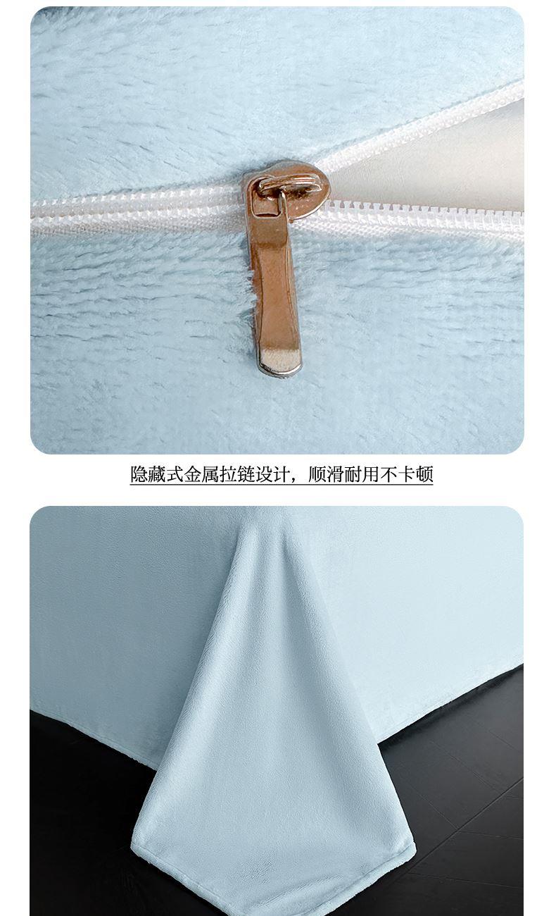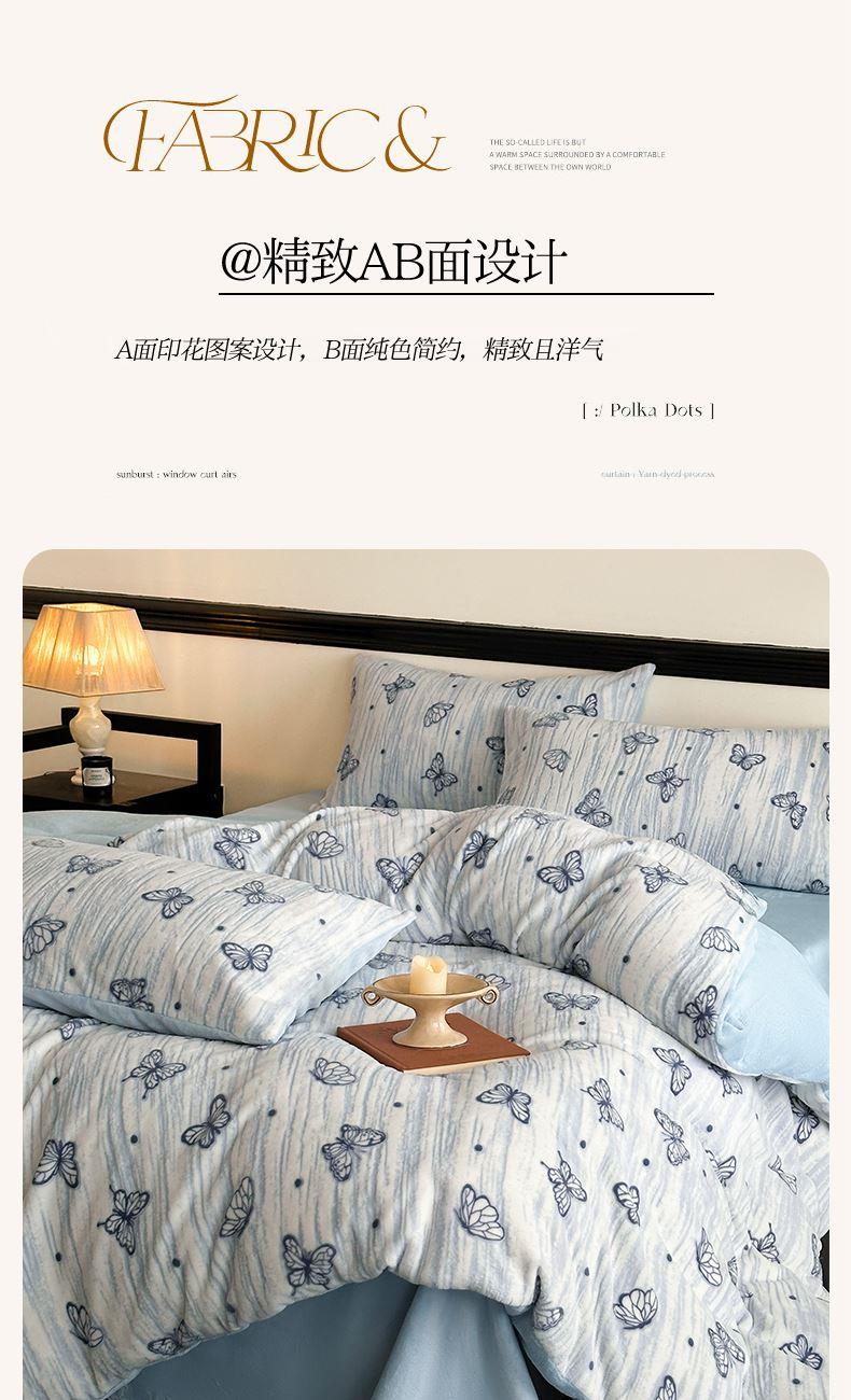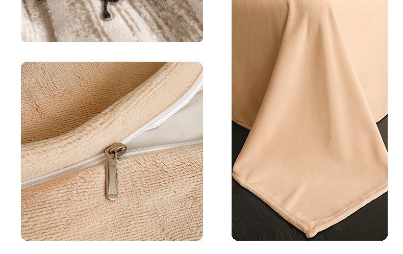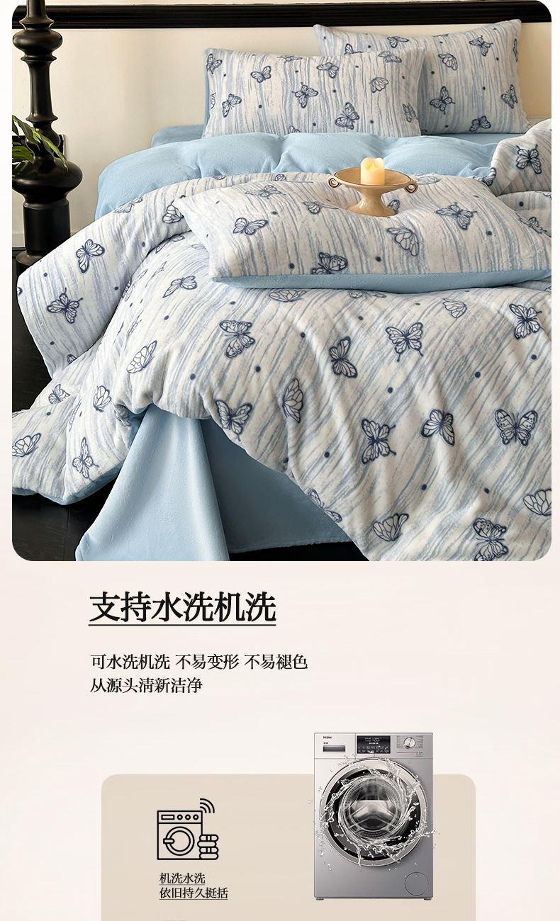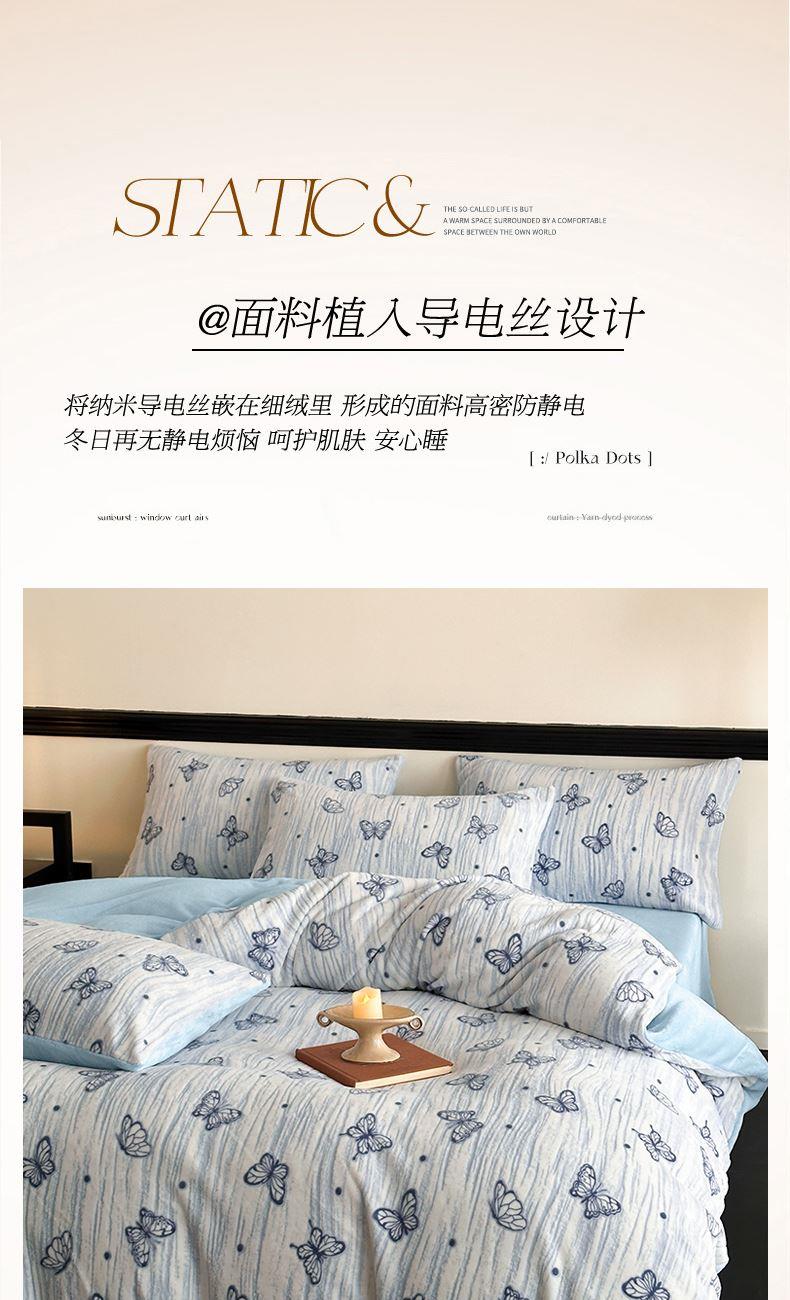 规格:1.5-1.8M床适用 被套200*230cm 床单230*250cm 枕套48*74cm 面料:牛奶绒 花色:香草灰、香槟色、月光绿、天空蓝 雕花牛奶绒面料,绒毛细密,不易起球和掉毛,撸猫般的柔顺手感,远离寒冬,高颜值AB双面设计,A面采用时髦洋气的印花图案点缀,栩栩如生,B面纯色简约,给卧室增添一抹冬日的亮色。