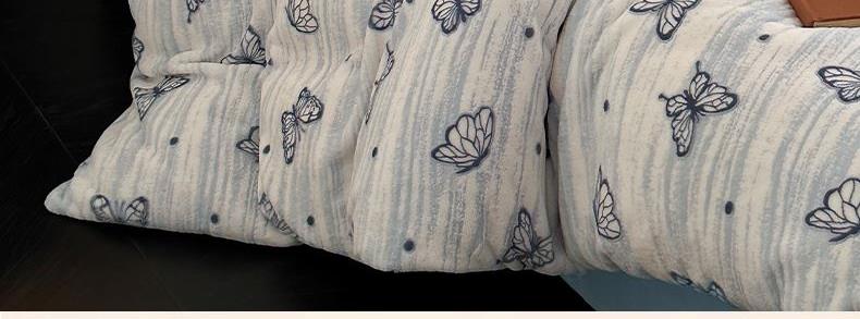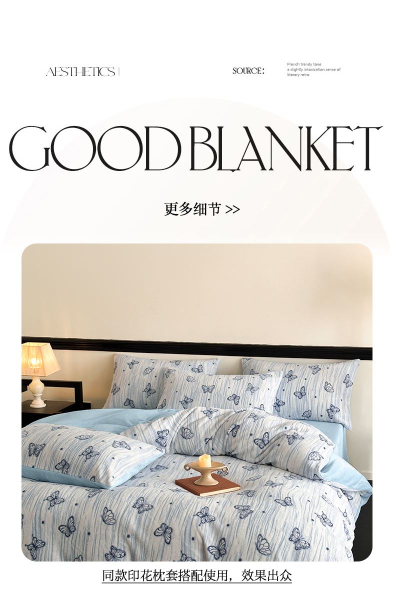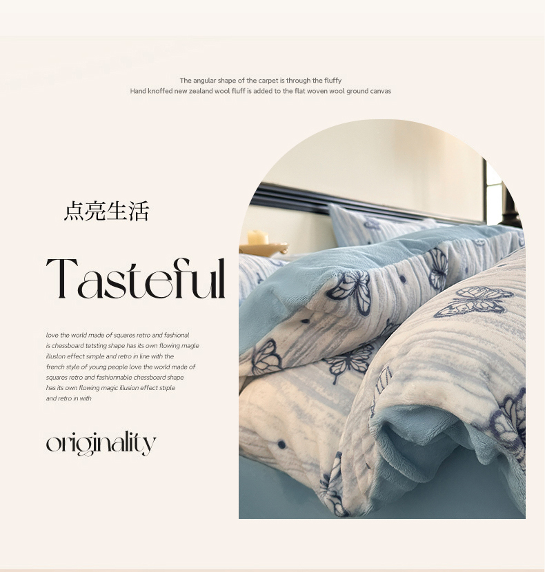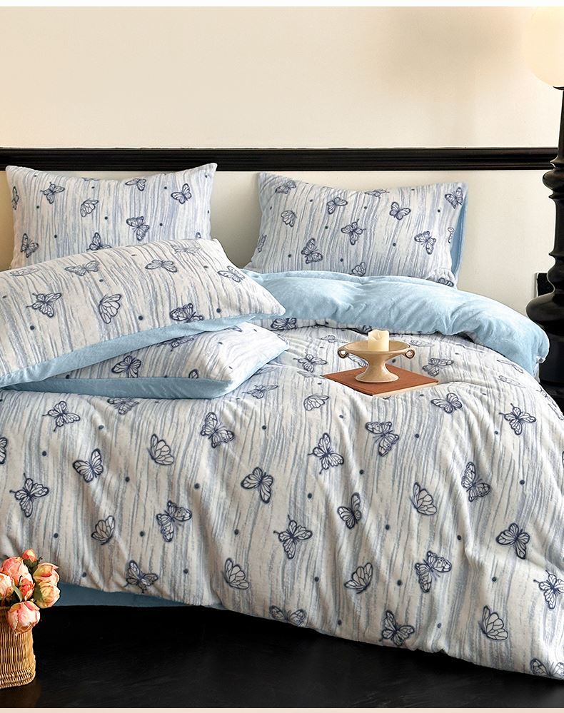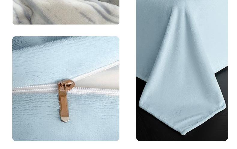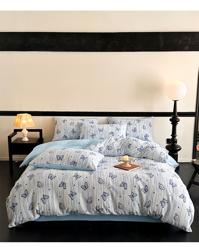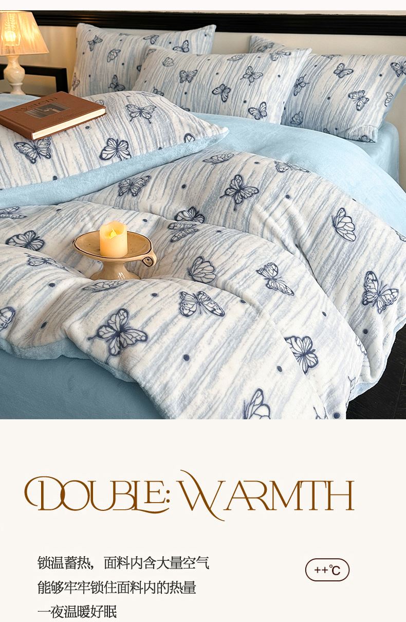 规格:1.5-1.8M床适用 被套200*230cm 床单230*250cm 枕套48*74cm 面料:牛奶绒 花色:香草灰、香槟色、月光绿、天空蓝 雕花牛奶绒面料,绒毛细密,不易起球和掉毛,撸猫般的柔顺手感,远离寒冬,高颜值AB双面设计,A面采用时髦洋气的印花图案点缀,栩栩如生,B面纯色简约,给卧室增添一抹冬日的亮色。