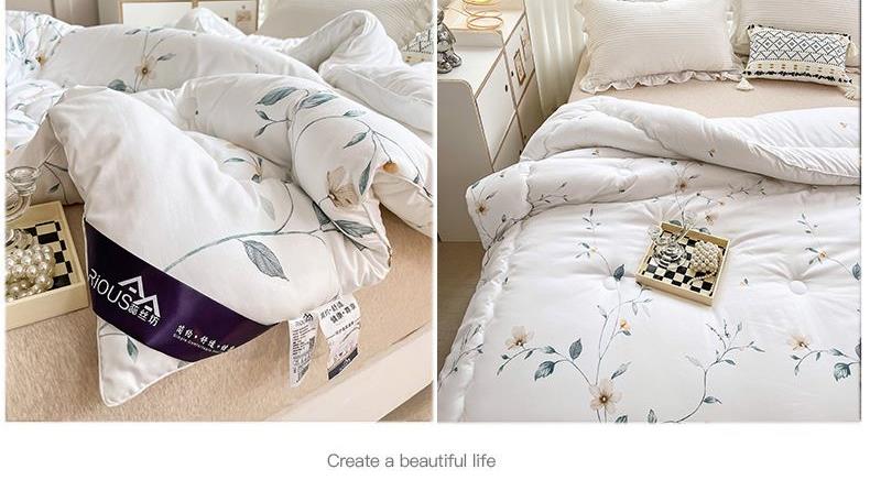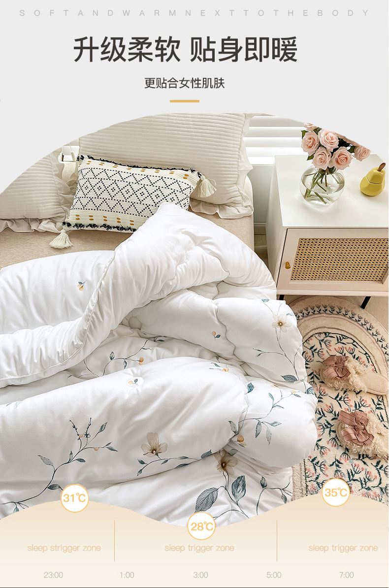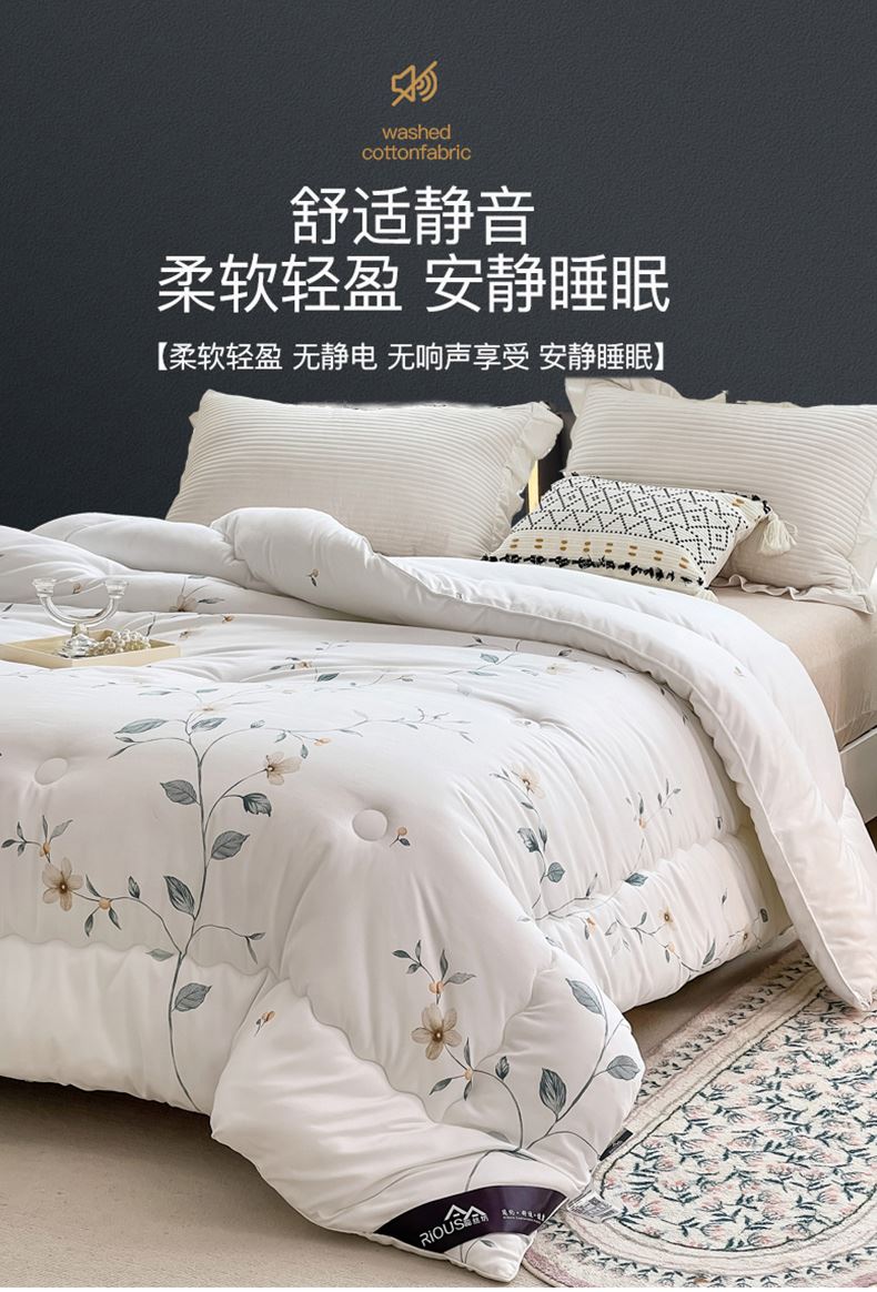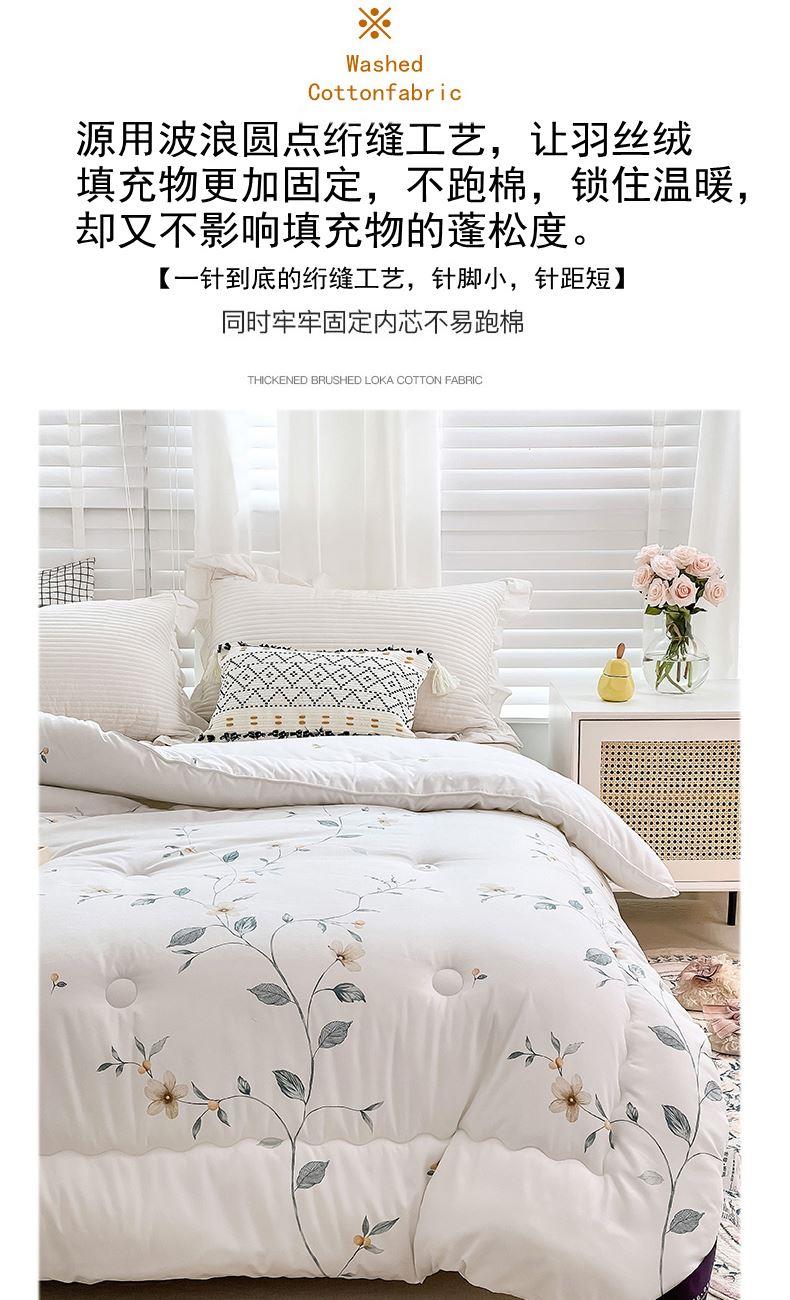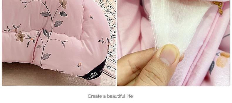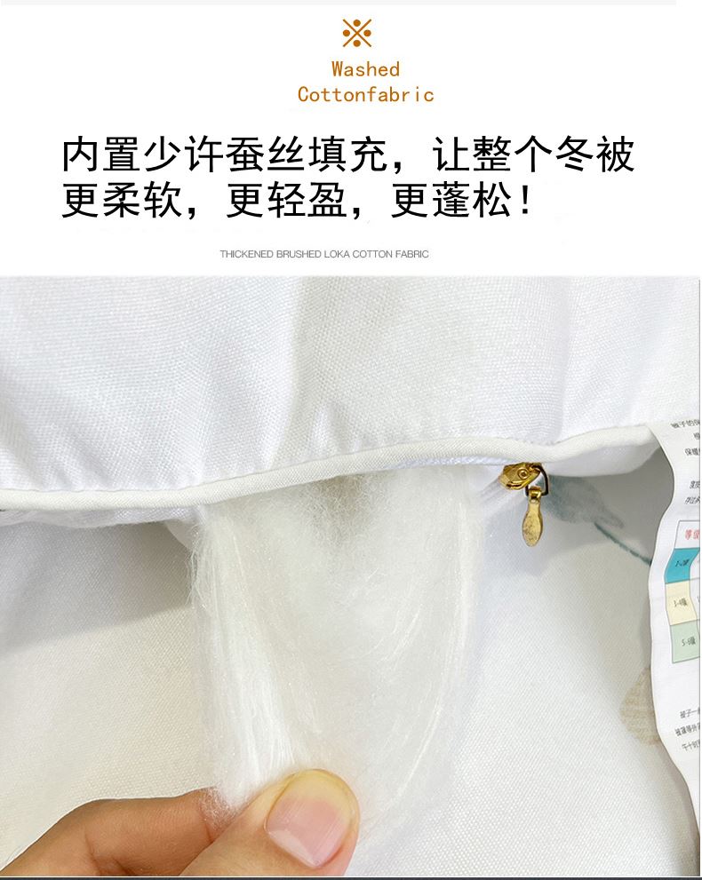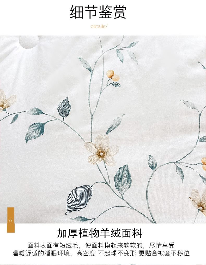 规格:220*240cm (10斤) 面料:植物羊绒面料 填充:整张羽丝棉+少许蚕丝 花色:粉色藤花 / 白色藤花 布料采用植物阳绒面料,活性印染,厚实保暖,源用波浪圆点绗缝工艺,让羽丝绒填充物更加固定,不跑棉,锁住温暖,却又不影响填充物的蓬松度。一针到底的绗缝工艺,针脚小,针距短/四周配了少许蚕丝使得整个被子更加透气性 柔软贴身。