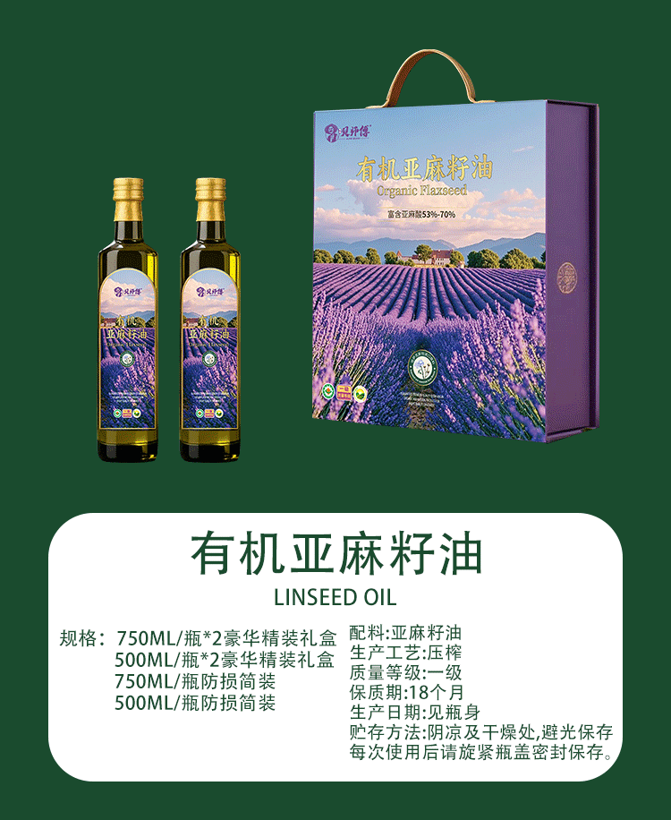 配置:750ml*2瓶礼盒 简介: 每一滴油,都来自无污染农场的有机亚麻籽。我们坚持从源头杜绝农药与化肥,确保您获得的,是纯净、安全与自然风味。 玻璃瓶装,持久锁鲜,鲜如现榨,头道油,更营养。 营养美味,全家共享,富含α-亚麻酸高达52%-70%,天然营养,老少皆宜。 甄选俄罗斯优质亚麻籽,俄罗斯处于高寒高纬度,拥有丰富的亚麻籽资源好油源自好原料,好原料成就好油。