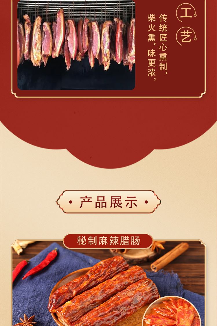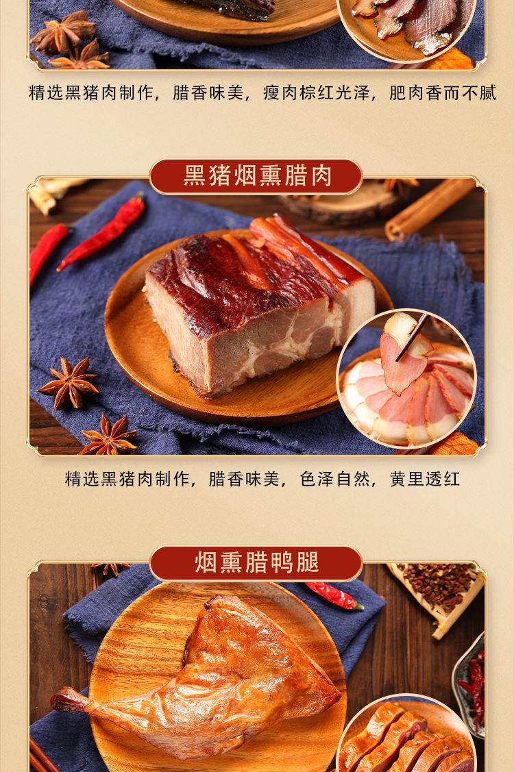 配置: 烟熏老鸡650g 烟熏风干腊鸭500g 黑猪五花腊肉250g 黑猪烟熏腊肉250g 广式鲜味腊肠400g 烟熏麻辣腊肠400g 烟熏年味腊鱼450g 烟熏腊鸭腿500g*2 简介: 高山黑猪肉:选用东辽高山黑猪肉,天然谷物果蔬喂养,林间自由慢养,肉质更鲜美,口感劲道,肉味醇香。 传统腌腊技艺:世代手艺,不断加工改良,远近闻名。 匠心腌制:将一块块肉质均匀的肉,融合多种香料,用以粽叶挂绳覆于缸内。 柴火慢熏:烟熏款采用核桃壳、柏树枝叶,橘皮,果木等以烟熏之,晾于通风之处,肉质干而不材,肉香馥郁。 精心晾晒:贝师傅腊味按照古法炮制,非烟熏款采用传统风干晾晒之法,在独有的气候条件下,经晒、吹、露,让腊制品自然孵化。