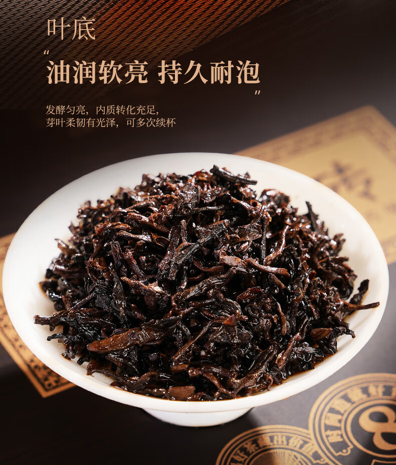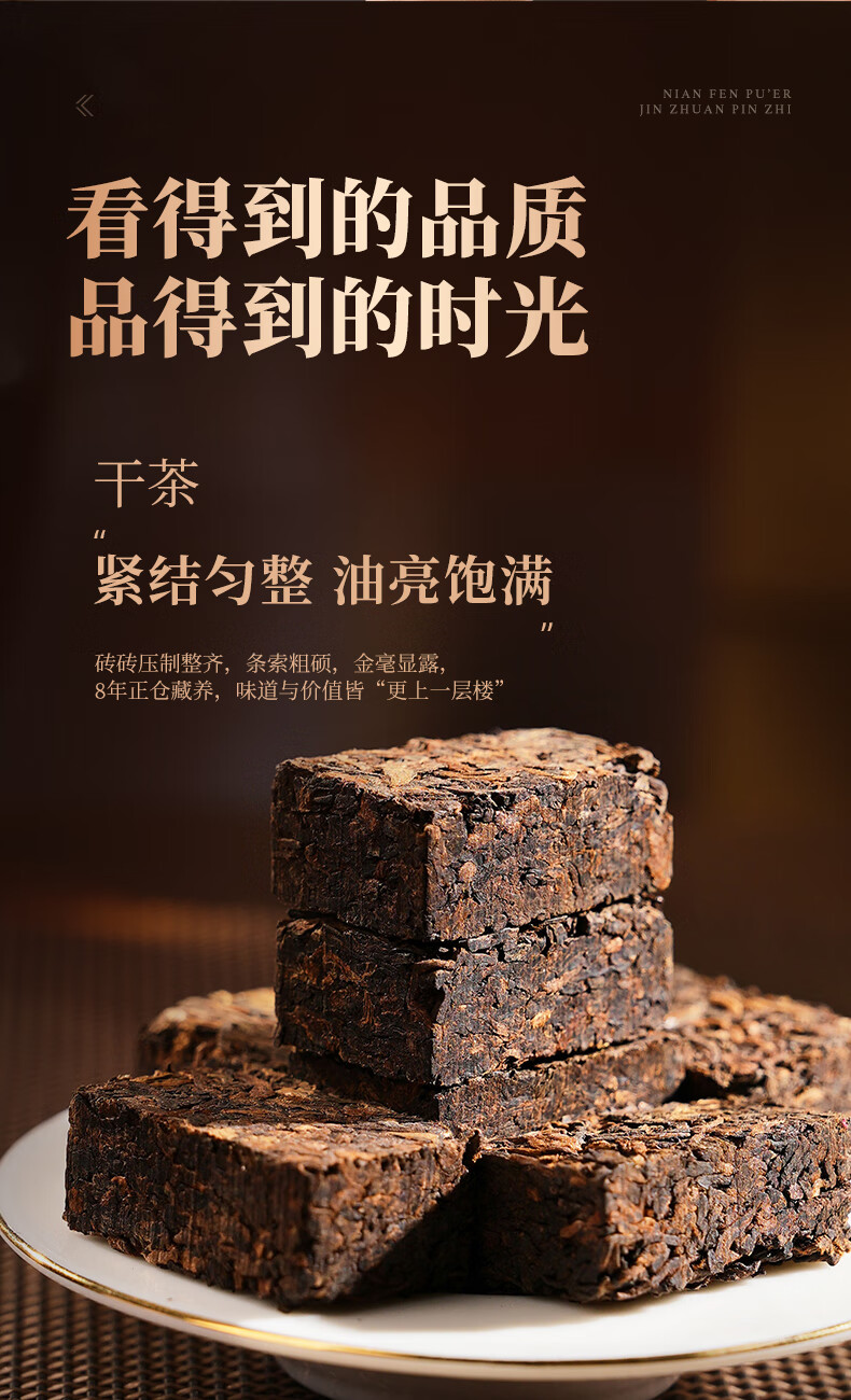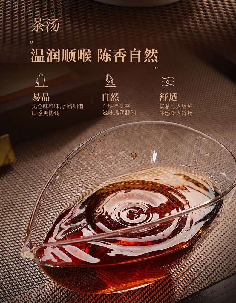 【品质特征】看得到的品质 品得到的时光 干茶紧结均整 油亮饱满 茶汤温润顺喉 陈香自然 叶底油润软亮 持久耐泡 茶品均有质检 品质好茶放心喝 实力值得信赖。
