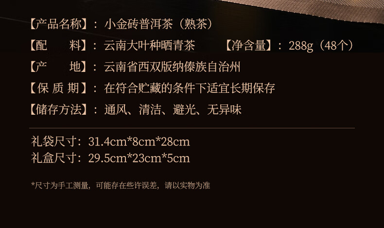 随行更便携 喝茶更简单 金锡箔纸独立装,轻巧便携,好存放更卫生,不易跑香:一砖一泡,片刻轻松享受陈年熟茶的乐趣。