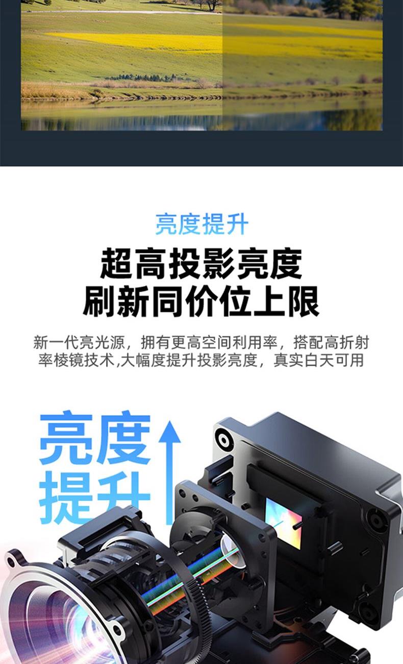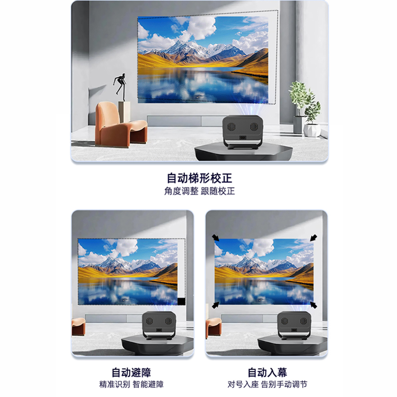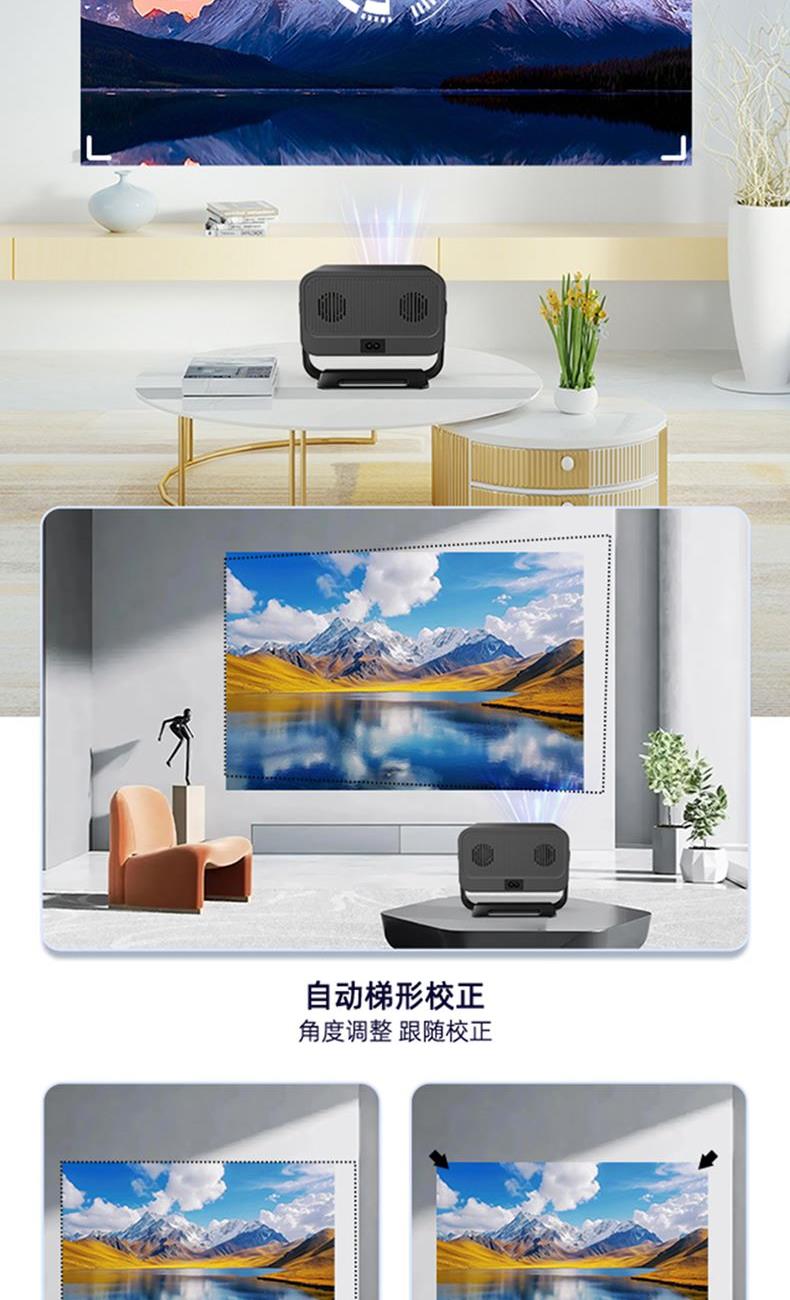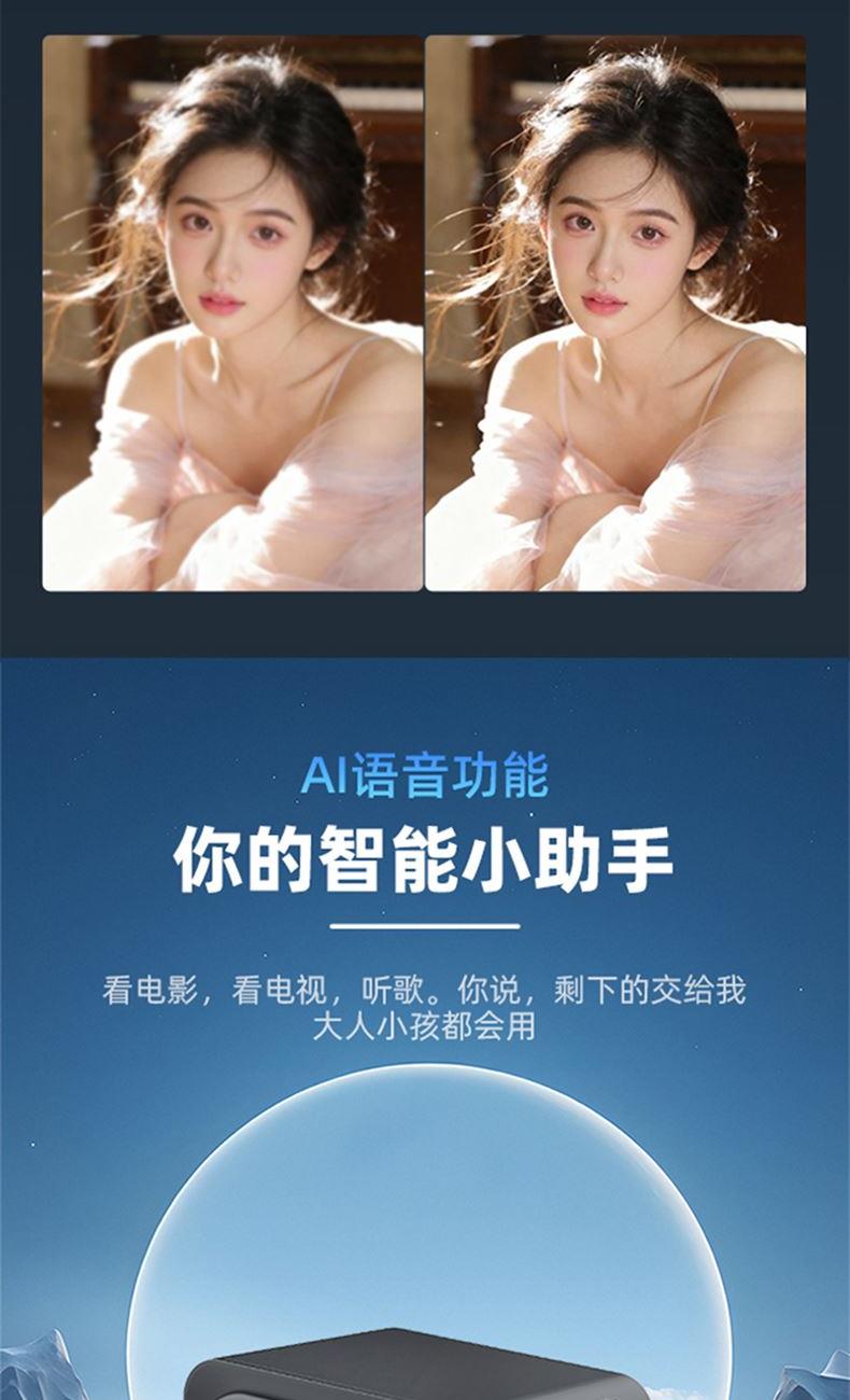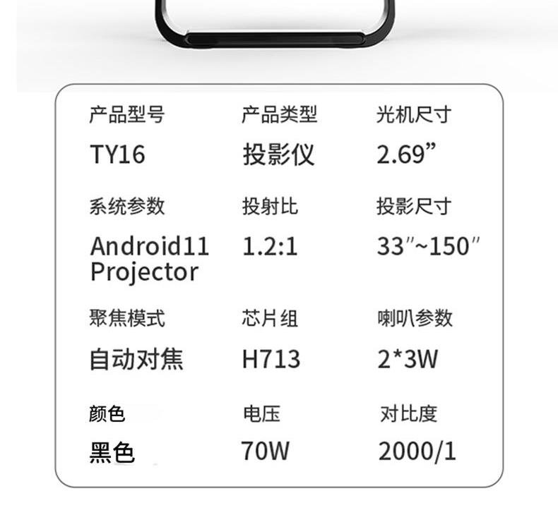 型 号 :TY16 颜 色:黑色 WiFi:2.4G +5.0G WIFI 系统版本:13.0安卓语音版 投射比:1.3:1 投影技术:2.69“LCD显示 梯形矫正:自动 支持高分辨率:1920*1080P 对比度:2000:1 亮度: 320ANSI Lumens 毛重:1280g 投影尺寸:40-120英寸 一箱 :12/件 产品尺寸:166*133.5*146mm Ai智能语音控制系统,高亮度家用、办公两用 自动对焦、自动入幕、自动避障、自动梯形,无需手动调节。支持苹果安卓手机同屏/投屏,内置安卓系统海量影片可在线观看。支持1080P高清播放,内置独立音箱,可多种设备链接,手机/电脑/平板/U盘/移动硬盘/网络盒子等,漫反射原理,呵护眼睛健康